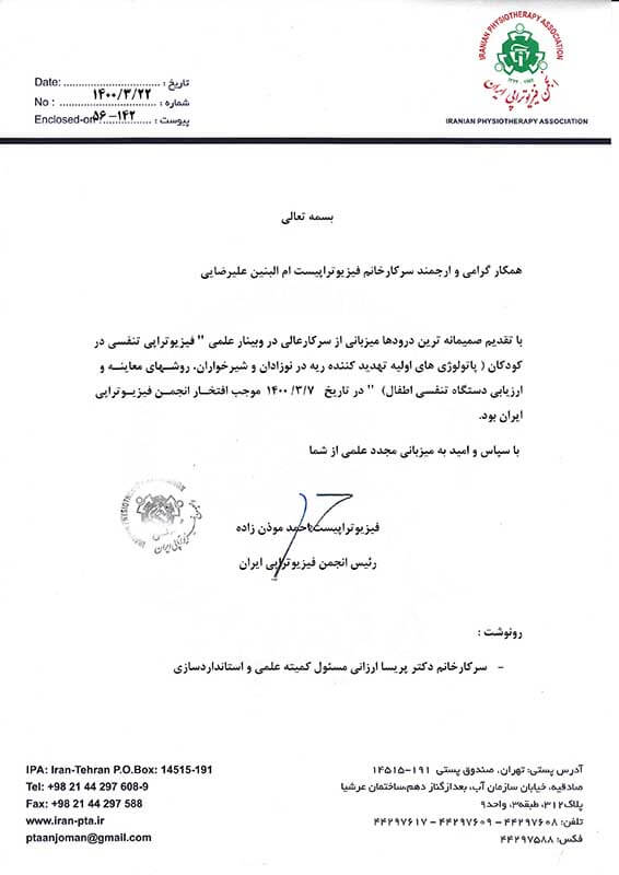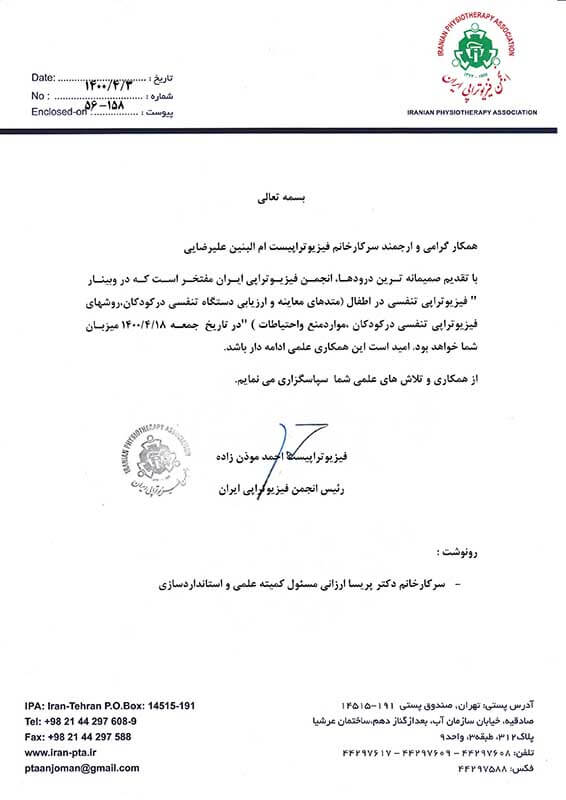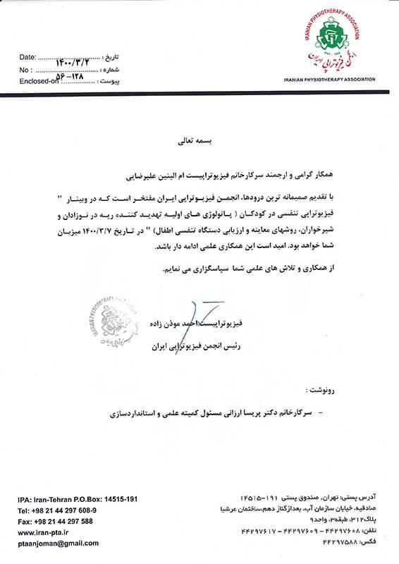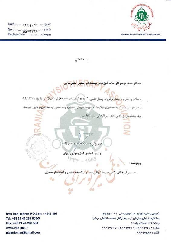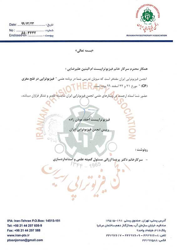 همکار گرامی و پرتلاش سرکار خانم فیزیوتراپیست ام البنین علیرضایی؛